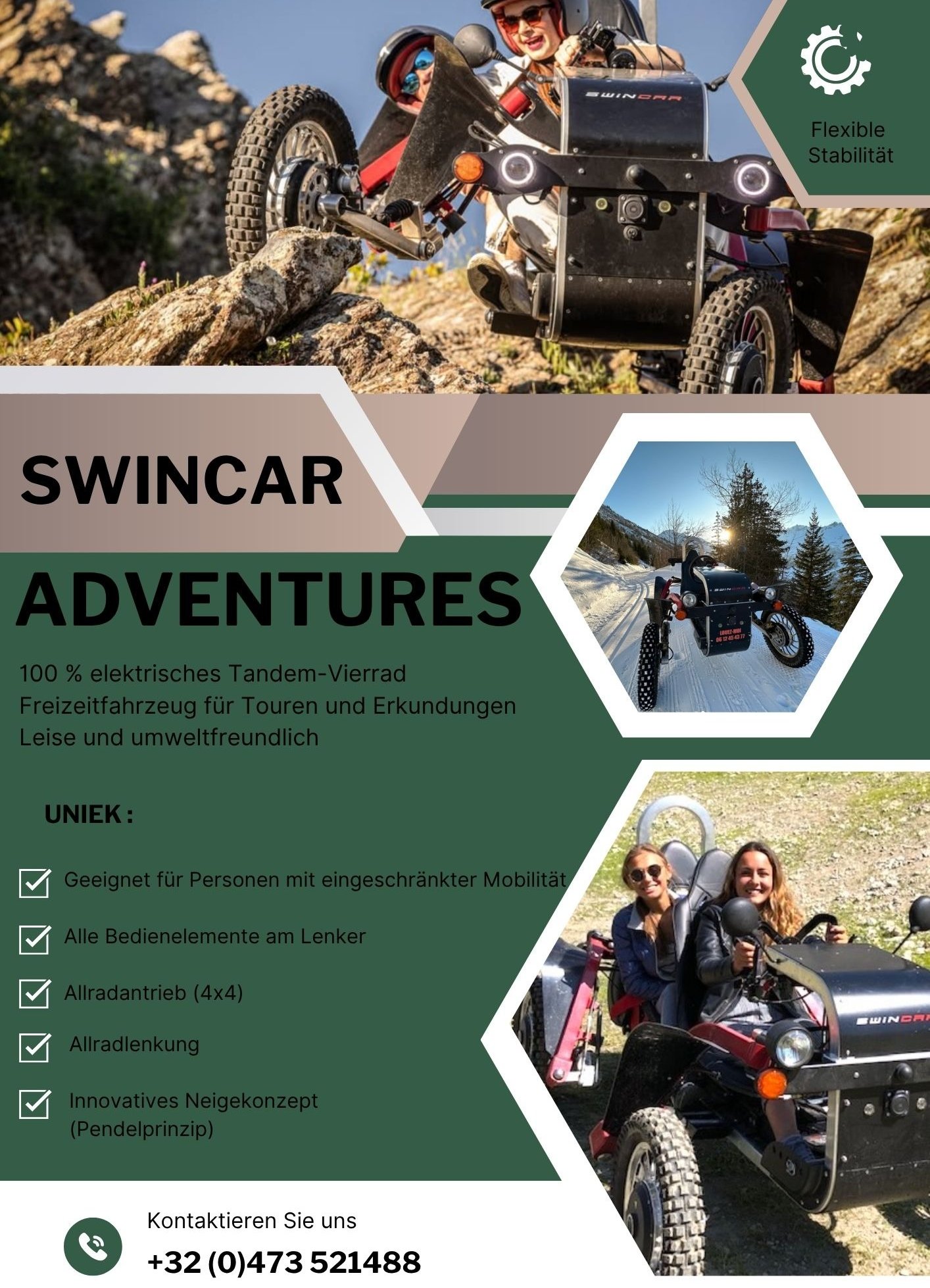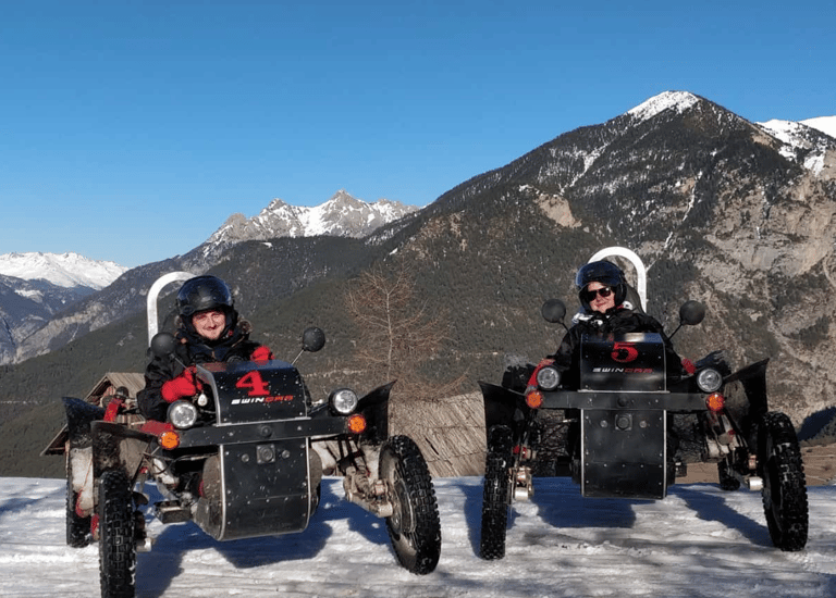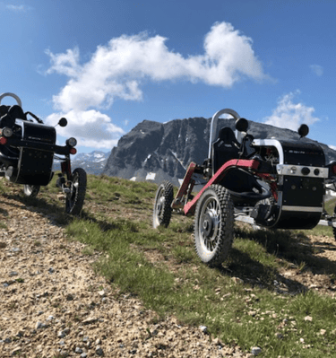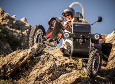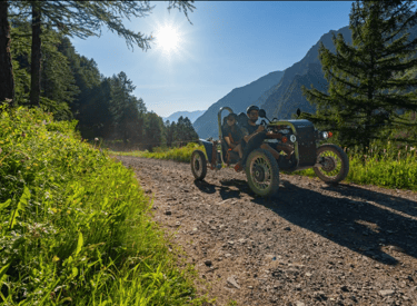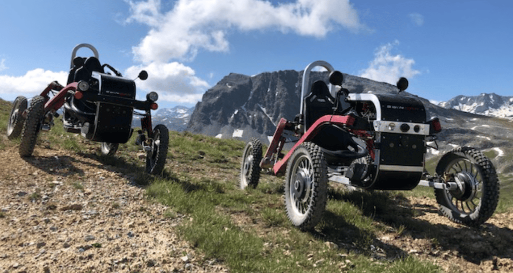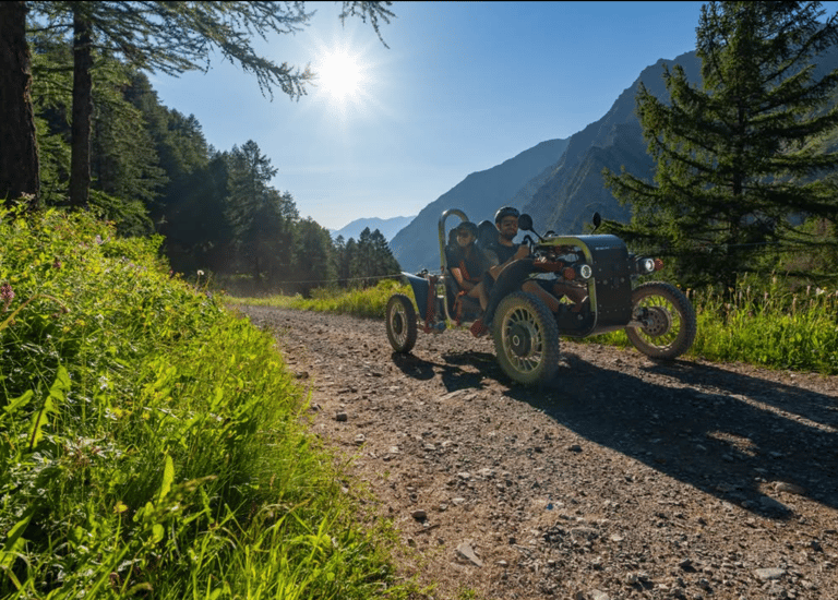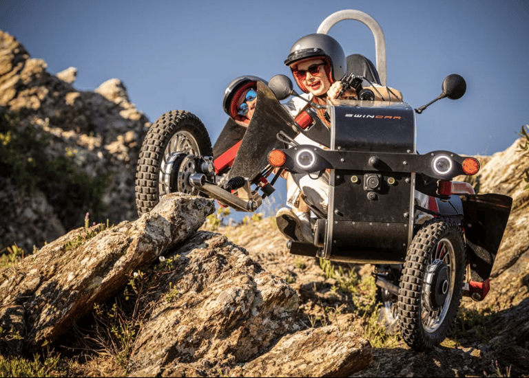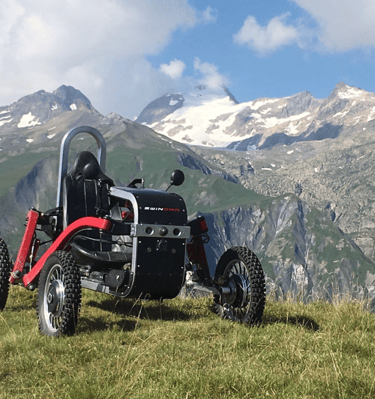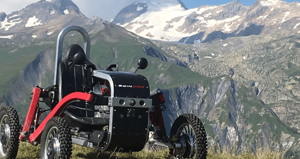 Ein Swincar ist ein einzigartiges Fahrzeug für abenteuerliche Fahrten in den Bergen, speziell entwickelt für Menschen mit Behinderung.